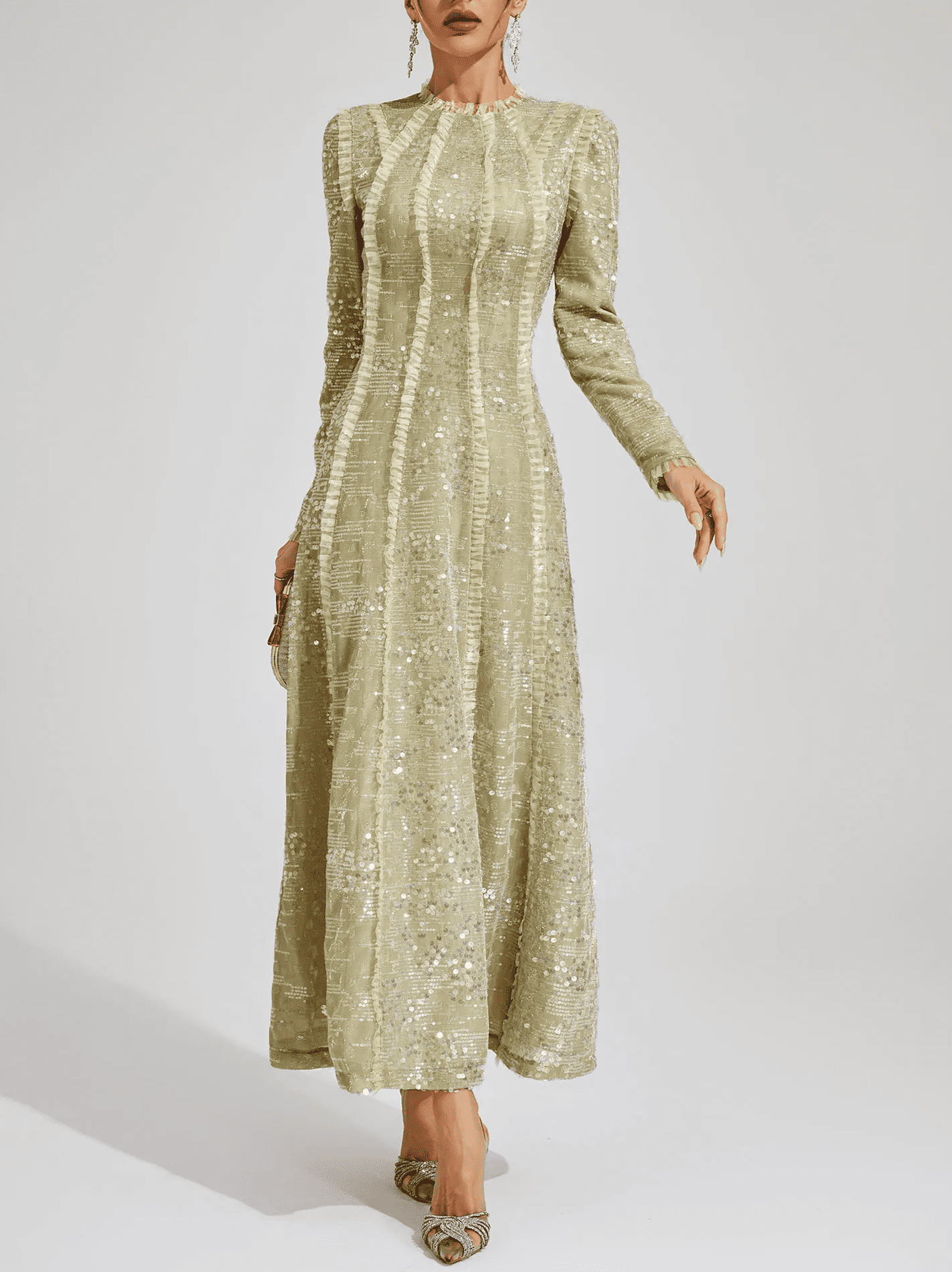 Shine bright in the Apricot Sequin Maxi Dress. This eye-catching gown boasts a chic apricot shade with shimmering sequins and vertical pleats. Feel glamorous and elegant at any special occasion.