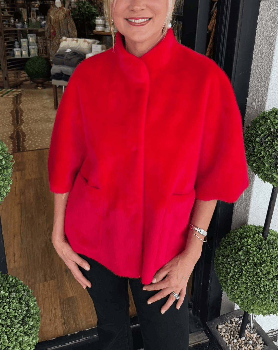 Expertly crafted in a stunning red hue, the Faux Capelet Jacket offers a beautiful pop of color to any outfit. Its eye-catching shade adds a touch of sophistication and elegance, making it the perfect addition to your wardrobe. Elevate your style with this must-have statement piece.