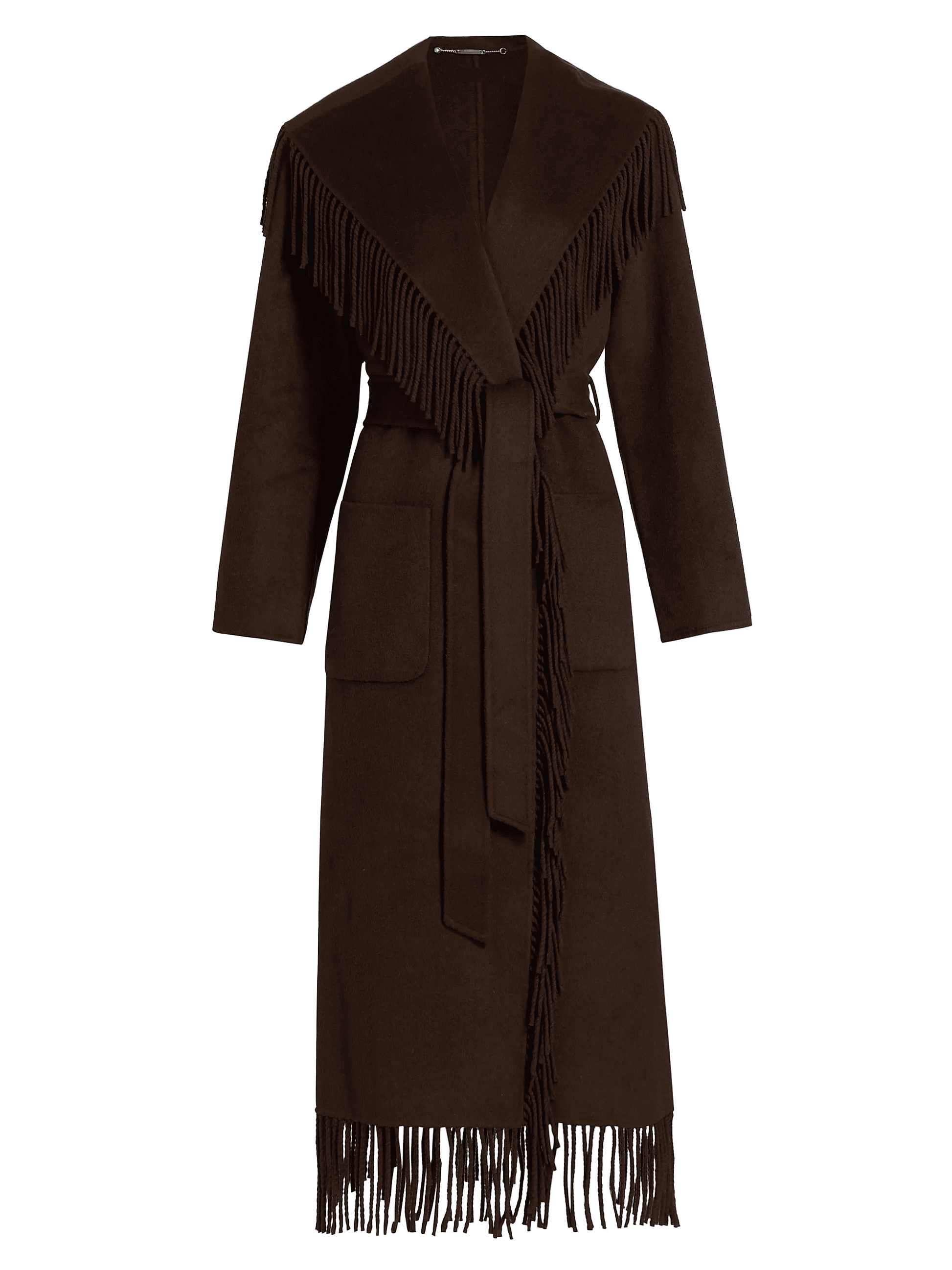 This coat features eye-catching fringe trim at the shawl lapels, open front, and hem. A self-belt and side patch pockets detail this style.